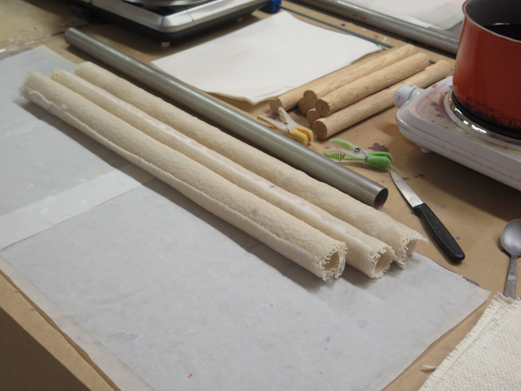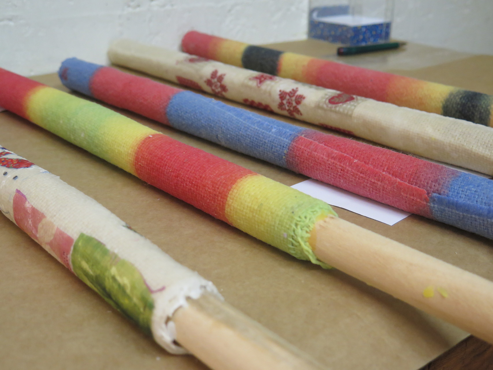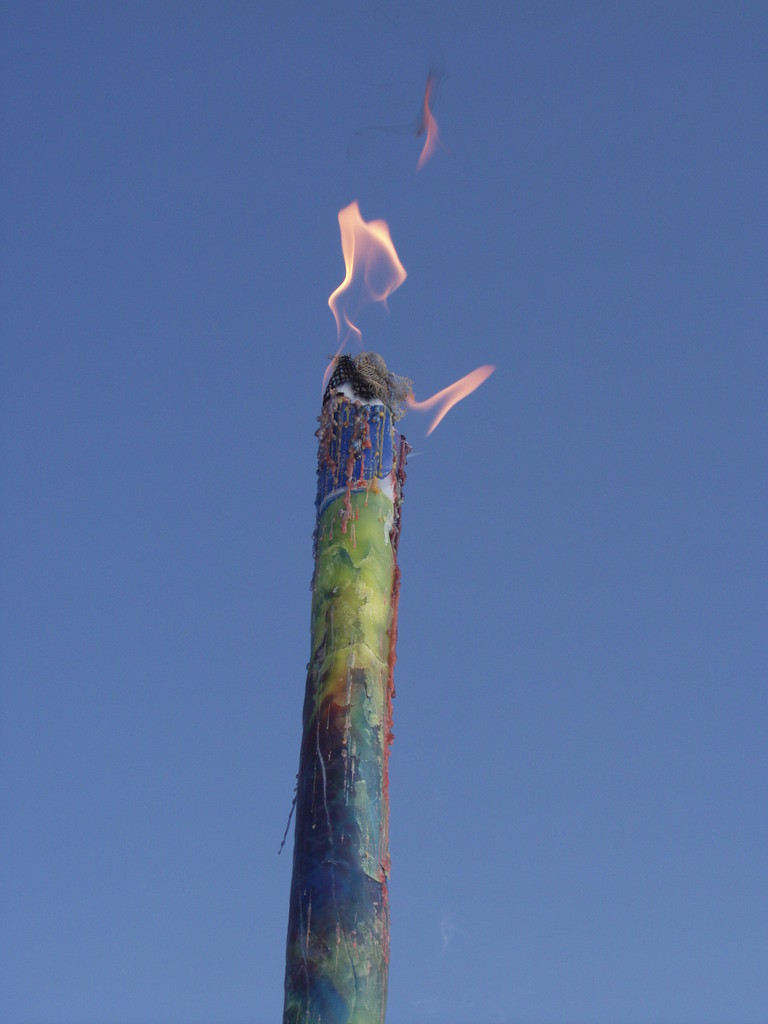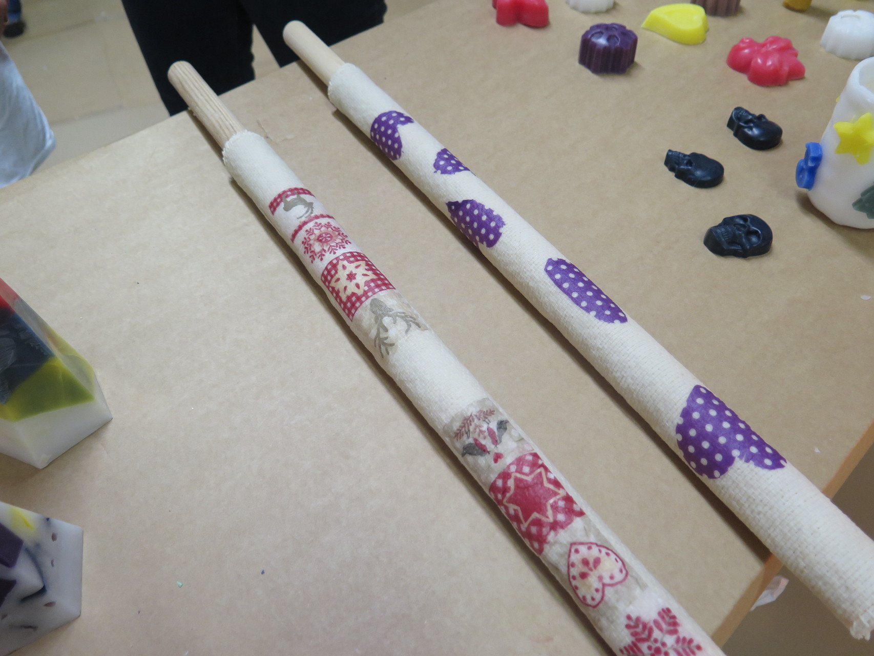 Die Fackeln am Böjuer Kerzenziehen werden mit flach gewalltem Farbwachs erstellt, Jute sorgt für die notwendige Brennbarkeit. Die Fackeln können mit verschiedenen Mustern und Farben erstellt werden, die Kreativität ist auch hier gefordert.